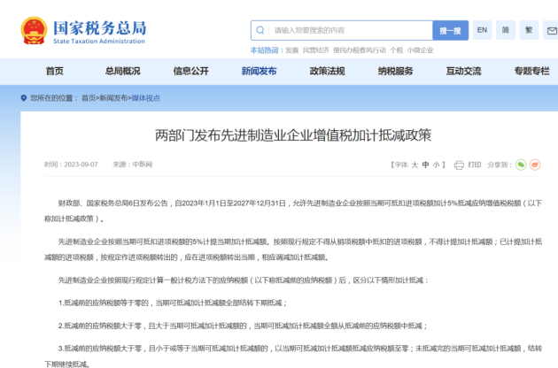 自2023年1月1日至2027年12月31日,允许先进制造业企业按照当期可抵扣进项税额加计5%抵减应纳增值税税额。