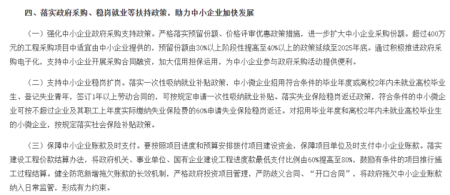 严格落实预留份额、价格评审优惠政策措施,进一步扩大中小企业采购份额。超过400万元的工程采购项目中适宜由中小企业提供的,预留份额由30%以上阶段性提高至40%以上的政策延续至2025年底。