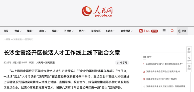 近日,人民网发布报道《长沙金霞经开区做活人才工作线上线下融合文章》。各式各样的人才活动,体现了金霞经开区打造人才近悦远来良好生态的一个缩影。