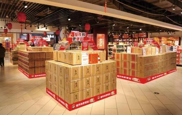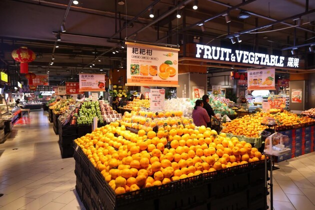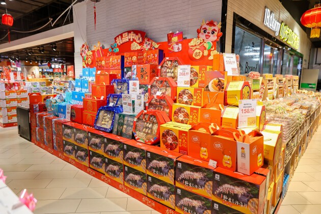 步步高大卖场里,春节传统元素将超市装扮得年味浓浓,年货产品更是琳琅满目。来自新疆的巴旦木、葡萄干、和田大枣等干果坚果品种齐全;从智利、澳大利亚进口的车厘子鲜红诱人;旺旺、徐福记、盐津铺子、沃隆等品牌从散装到大礼包应有尽有……