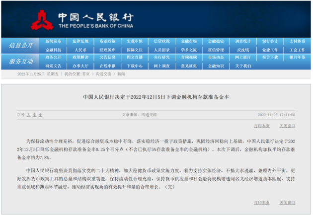 近日,中国人民银行决定于2022年12月5日降低金融机构存款准备金率0.25个百分点(不含已执行5%存款准备金率的金融机构)。